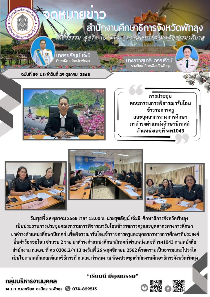 การประชุมเพื่อพิจารณารับโอนข้าราชการครูและบุคลากรทางการศึกษาที่ประสงค์ยื่นคำร้องขอโอน มาดำรงตำแหน่งศึกษานิเทศก์ ตำแหน่งเลขที่ พท1043 / จดหมายข่าว / By admin-pr2
