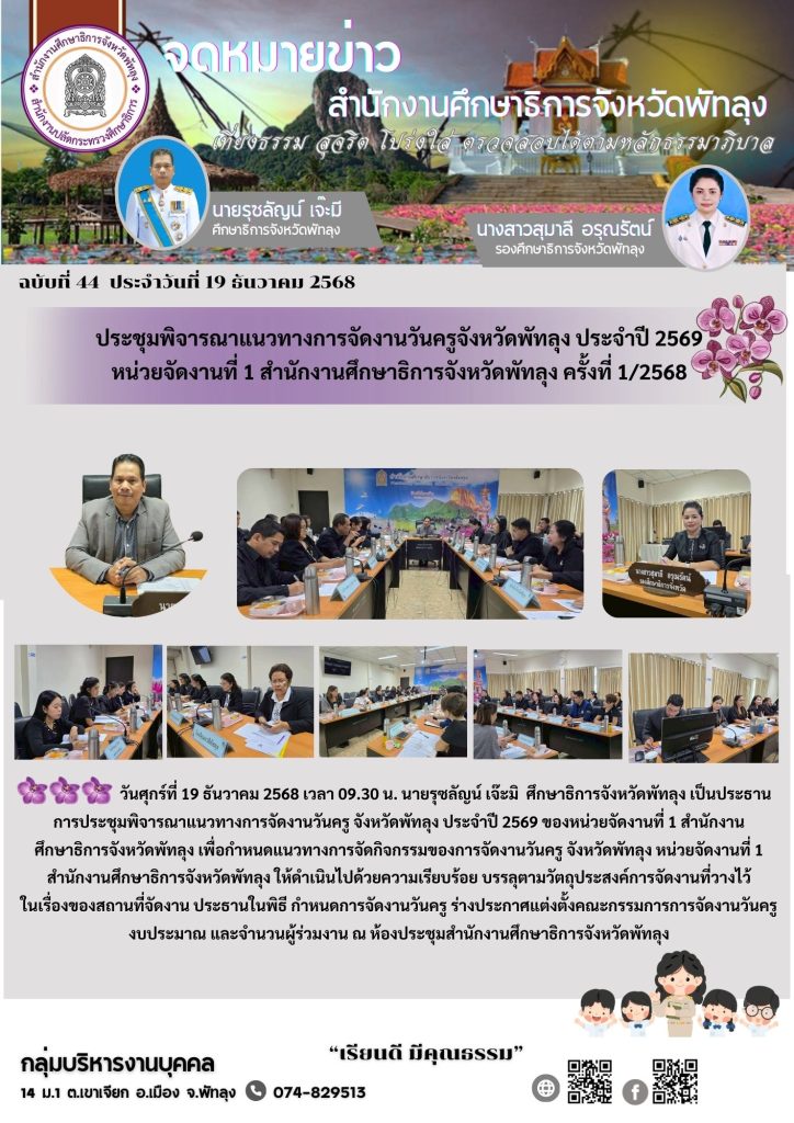 ประชุมพิจารณาแนวทางการจัดงานวันครูจังหวัดพัทลุง ประจำปี 2569 หน่วยจัดงานที่ 1 สำนักงานศึกษาธิการจังหวัดพัทลุง ครั้งที่ 1/2568 / จดหมายข่าว / By admin-pr2