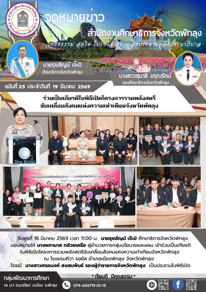 ร่วมเป็นเกียรติในพิธีเปิดโครงการรวมพลังสตรีขับเคลื่อนสังคมแห่งความเท่าเทียมจังหวัดพัทลุง